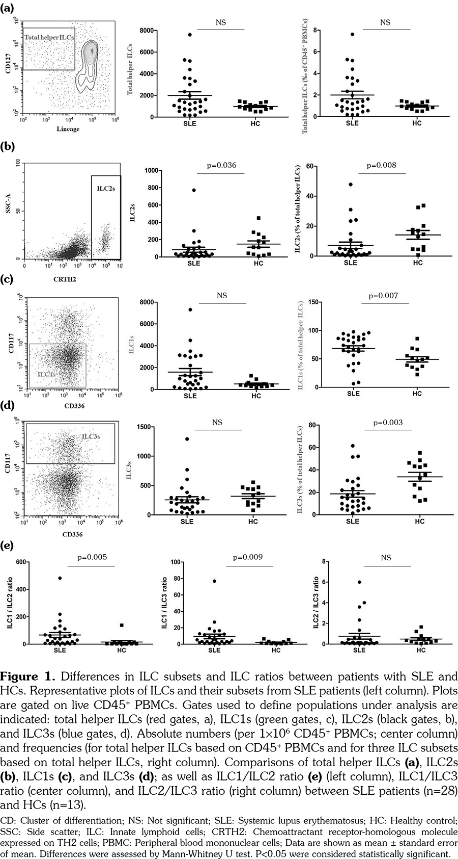 Patients and methods: We recruited 28 SLE patients (6 males, 22 females; mean age 37.57 years; range, 18 to 56 years) and 13 healthy controls (4 males, 9 females; mean age 32.08 years; range, 19 to 48 years). Circulating ILC subsets were identified by flow cytometry. Associations between all detected cells and SLE disease activity, clinical manifestations, and serum autoantibodies were analyzed.