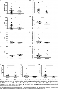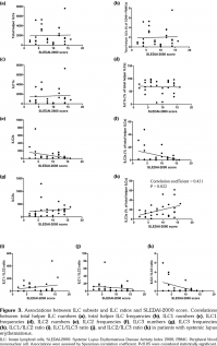 Finally, we analyzed the relationships between ILC subsets and the serological features in SLE (including ANA titer, anti-dsDNA titer, serum IgG/A/M level, serum C3/C4 level, ESR level, CRP level, and other autoantibodies). The results showed that the absolute numbers of ILC3s were positively correlated with serum anti-dsDNA titers (correlation coefficient=0.504, p=0.006) (Table 2). There were no correlations between other ILC subsets and serological features (data not shown).