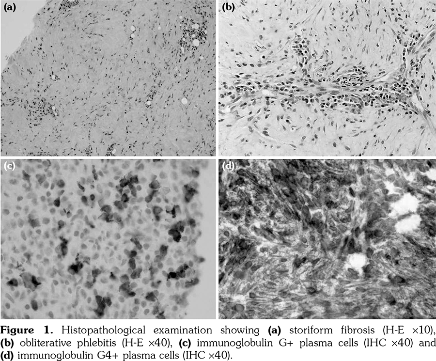 In 2012, an international consensus on the pathology of IgG4-RD was published. For the diagnosis of IgG4-RD, two out of the following three criteria should be present: (i) dense lymphoplasmacytic infiltrate, (ii) storiform fibrosis and (iii) obliterative phlebitis. Neutrophilic infiltration and epitheloid cell granuloma argue against the presence of IgG4-RD.[9]
