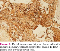 Bone biopsy was performed due to increased signal intensity and the observation of lytic and destructive lesions on lumbovertebral MRI scans. Fibrotic tissue fragments were observed among the bone spicules in tissue samples. The increased number of plasma cells in these tissue fragments was remarkable (Figure 3). Immunostaining for IgG and IgG4 showed diffuse staining for IgG, and IgG4 11/high- power field (HPF) was observed (Figure 4). Serum IgG and serum IgG4 levels were found to be elevated according to Oxford immunology data (IgG4: 336 mg/dL [10-135 mg/dL], IgG: 1656 mg/dL [600-1600 mg/dL]).
