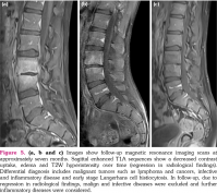 There is limited data on spinal involvement in the studies to date; however, in a study by Lu et al.,[4] cases of pachymenigitis related to a 6-year period were evaluated by literature review. A total of 38 patients were identified in this review. Intracranial involvement was observed in 80% of them, while eight patients had spinal pachymeningitis. The most commonly involved sites were the cervical and thoracic vertebrae. Only one patient was found to have lumbar vertebral involvement. To our knowledge, the present study is the first reported pediatric case with lumbar vertebral involvement.