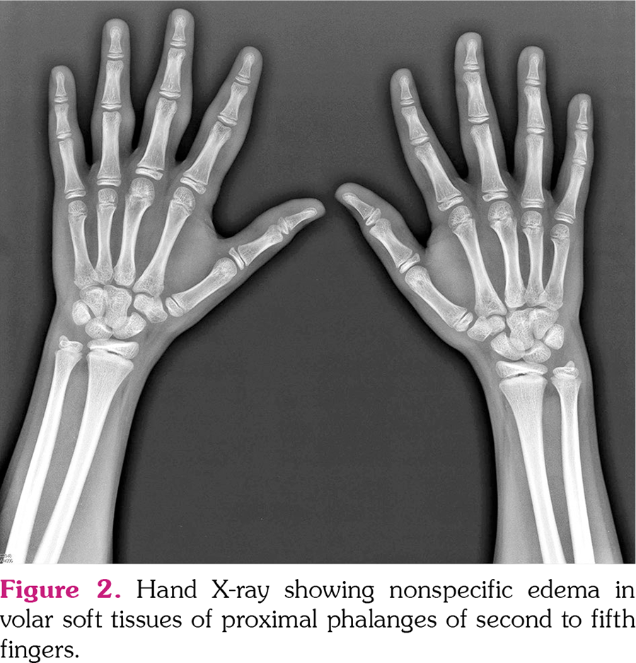 A previously healthy 12-year-old male patient presented with one-year history of bilateral (left more than right) swelling of the proximal interphalangeal (PIP) joints (Figure 1). The patient denied any tenderness with movement, nocturnal pain, or morning stiffness. The only findings on physical examination were swelling of the PIPs of the fingers. Laboratory investigations including complete blood count with differentials, erythrocyte sedimentation rate, rheumatoid factor, and antinuclear antibodies were normal. Hand radiographs revealed nonspecific swelling of the volar soft tissues abutting the distal metaphysis of the proximal phalanges of the second to fifth fingers (Figure 2). The patient was diagnosed with Thiemann’s disease (Online Mendelian Inheritance in Man: 165700).