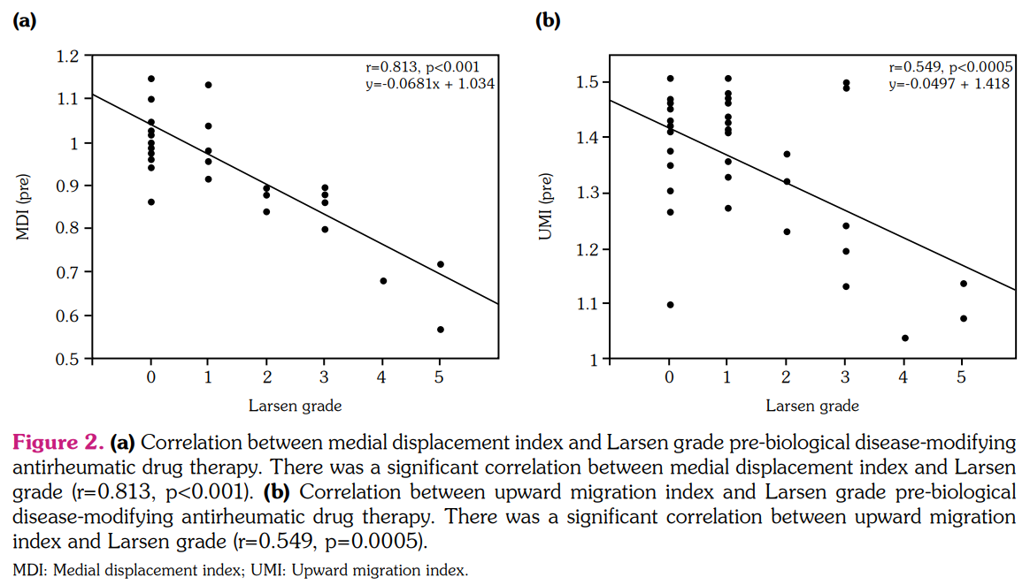 Conclusion: Medial displacement index and UMI correlated with the Larsen grade of the shoulder joint strongly and moderately, respectively. This study suggests that MDI and UMI may help to evaluate radiographic progression of damage in shoulder joints in patients on bDMARDs, which is difficult to detect using the Larsen grade.