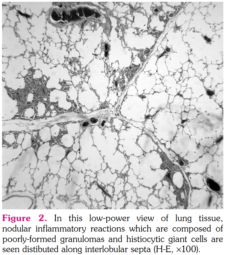 The smears of bronchoalveolar lavage (BAL) were negative for any bacteria, fungi, or acid- fast bacilli. Cytological examination revealed numerous macrophages, few lymphocytes, and few neutrophils. BAL cultures were also negative. Serological tests for the infection of viruses and fungi were negative. The pathological examination of pulmonary wedge resection performed from lingula revealed foreign-body type giant cell reaction and poorly- formed non-caseating granulomas distributed mainly along interlobular septa and subpleural zones (Figure 2). Asteroid bodies as well as a birefringent material were seen in the cytoplasms of giant-cell histiocytes under polarized microscope (Figure 3a, b). Histochemical stains did not reveal any microorganisms and lung tissue cultures were also negative for any mycobacteria species. Based on the clinical, radiological, and pathological findings, a diagnosis of sarcoid-like granulomatous reaction induced by adalimumab was confirmed. Given the lack of radiological response four months after cessation of adalimumab, methylprednisolone 32 mg/day peroral was initiated. The patient was controlled every month initially and every two months thereafter with a gradual reduction in methylprednisolone dosage. At the end of nine months of steroid therapy, a control CT of thorax revealed stable nodular opacities in both lungs. As psoriatic lesions gradually increased and worsened during this period, ustekinumab was started.