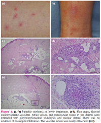 Although various AZA-associated cutaneous adverse events have been reported so far, only a few reports of CSVV have been published. Appelman and Wintzen[1] described a woman with Crohn’s disease who developed pruritus and CSVV due to AZA. Intriguingly, this patient was using AZA for two years, but vasculitis occurred after the daily dose of AZA was doubled. Beckett et al.[2] also described a man with immune thrombocytopenia presenting with fever and CSVV nine days after AZA administration. The typical onset of CSVV after exposure to a trigger such as a drug is seven to 10 days.[3] The time from AZA administration to onset in our case was consistent with previous reports. However, unlike Appelman and Wintzen’s[1] report, the dose of AZA was low. Although she did not approve drug challenge tests to delineate the nature of the AZA adverse event, she had a total score of 8 on the Naranjo scale, estimating the probability of adverse drug reactions, indicating a probable adverse reaction to AZA.[4]