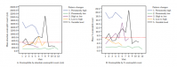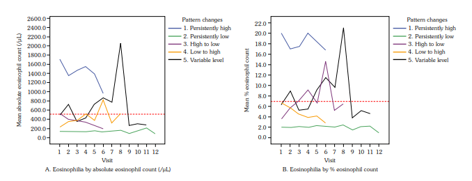 The definitions of the clinical and laboratory parameters used in this study were previously described.[17] The World Health Organization defined eosinophilia by the presence of an increased number of peripheral blood eosinophils exceeding the upper limit of normal, 3 to -5% white blood cell count, or an absolute white blood cell count of 350 to 500/μL.[18] Reference intervals for absolute eosinophil count (AEC) (and percent eosinophil count [PEC]) in healthy Thai adults were 100 to 800/μL (0.8 to 9.2%) in males and 30 to 500/μL (0.4 to 7.5%) in females, respectively.[19] Thus, in this study an AEC of >500/μL or a PEC of >7% was defined as eosinophilia. This study collected AEC and PEC at every visit and, then, plotted the values to define pattern changes over one year. Indeed, the numbers of visits over one year by each patient were unequal. Visit numbers varied from 6 to 12 visits and, therefore, if a group of patients had six visits, the corresponding linear plot would be shorter than for a group of patients who had 12 visits. There was no standard classification that defined pattern changes of eosinophilia. Based on the definition of hypereosinophilia as a blood AEC of ≥1,500/μL obtained on at least two separate occasions (interval ≥1 month)[20] and the fact that eosinophilia could be transient, episodic, or persistent, patients were arbitrarily categorized into one of the following five groups based on the corresponding linear plots over one year (longitudinal perspective): persistently high (PH) group, persistently low (PL) group, high-to-low (HL) group, low-to-high (LH) group, or variable levels (VL) group. These data were, then, used to further categorize the PH group into the eosinophilia group and the PL+HL+LH+VL (non-PH) groups into the non-eosinophilia group. At the baseline visit, the patients were also categorized into baseline eosinophilia and non-eosinophilia groups (cross-sectional perspective). In this case, patients who had baseline eosinophilia were defined as having PerE.