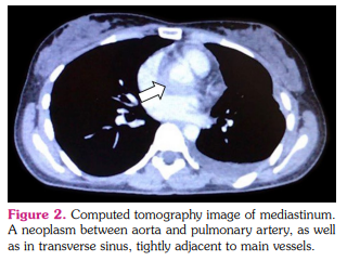 A 25-year-old female patient presented to a rheumatologist with complaints of severe weakness, shortness of breath with mild physical exertion, palpitations, low-grade fever in the evening, tightness of the chest, and weight loss by 6 kg within the past four months. She reported that she felt herself ill for six months. Initial complains were shortness of breath, fever, and pressure pain behind the sternum. The patient consulted a cardiologist, and echocardiography revealed a neoplasm in the anterior mediastinum (Figure 1). The hypodense structure without clear contours, semicircular in the circumference of the non-coronary and left coronary sinus of the aorta, spreading and circularly enveloping the mouth of the left coronary artery, causing a narrowing of the lumen up to 70 to 80% was detected by intravenous contrast-enhanced computed aortography. A similar structure was identified along the pericardial layers in the circumference of the mouth of the pulmonary artery trunk (Figure 2). Due to the impossibility of the radical removal of the neoplasm to clarify the diagnosis, it was decided to perform a biopsy of the mass fragment. Stenting of the left coronary artery was performed. Laboratory test results were as follows: anemia (hemoglobin: 104 g/L); eosinophilia (relative numbers and absolute) 12%, 1.3-1.5x109 /L; erythrocyte sedimentation rate 53 mm/h, and C-reactive protein 31 g/dL. Detected serum immunoglobulin G4 (IgG4) in a high titer-1,030 mg/dL (normal range: 3 to 201 mg/dL). Antineutrophilic cytoplasmic antibodies to myeloperoxidase (ANCA-MPO) were in high titer: 5.2 AI. On multislice computed tomography (MSCT) of the thorax with bolus enhancement, the contrast was accumulated along the periphery and in both lungs with multiple ring-like foci, close to the density of “ground glass” appearance.