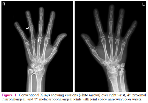 She had refractory RA activity under MTX 15 mg/week, prednisolone 5 mg/day, and sulfasalazine (SAZ) 2 g/day. Conventional X-rays demonstrated erosions over right wrist, proximal interphalangeal and metacarpophalangeal joint areas with joint space narrowing over wrists (Figure 1). The RTX therapy with a regimen of 1 g x two fortnightly infusions every six months was initiated from 2016, with a total of 20 infusions until the end of 2020. There were completely depleted circulating CD19-positive B cells (0/µL) after two infusions, normalized ESR/CRP levels with a reduced DAS28 to 2.99 after four infusions, followed by negative anti-AQP4 (1 U/mL, normal reference below 3 U/mL), anti-CCP (below 7 U/mL), and RF (below 20 IU/mL) levels. She had an improved ophthalmological vision to decimal visual acuity 0.06/0.04 (right/left) in 2019. After 20 infusions, the DAS28 further improved to 2.10 and MTX doses were tapered to 7.5 mg/week without using SAZ. Except for initial infusion-related reactions, no adverse effects were observed during RTX therapeutic period. A written informed consent was obtained from the patient for all diagnostic and therapeutic procedures.