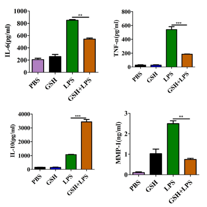 At 24 h after GSH treatment, the protein levels of IL-6, TNF-α, IL-10, and MMP-1 secreted from MH7A were evaluated via ELISA (Figure 4). The IL-6, TNF-α, and MMP-1 levels were lower in LPS+GSH group compared to the LPS group (p<0.05), However, IL-10 was significantly increased after GSH treatment. These results indicated that GSH suppressed the secretion of inflammatory cytokines and enzymes degrading collagen in MH7A.