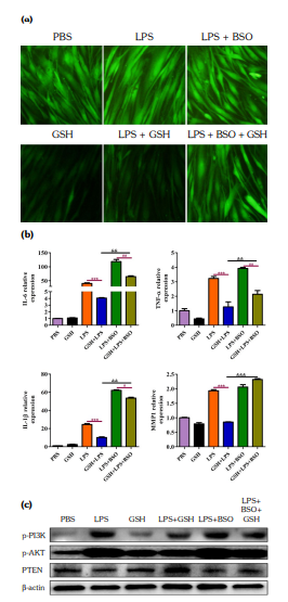 After the administration BSO, the mean fluorescence intensity was detected, and it was found that ROS levels were higher in the BSO+LPS+GSH group compared to the LPS+GSH group (Figure 6A). Furthermore, the mRNA expression levels of IL-6, TNF-α, and IL-1β were higher in the BSO+LPS+GSH group compared to the LPS+GSH group (Figure 6b). Similarly, the mRNA expression of MMP-1 was increased after BSO treatment. In addition, Western blotting results indicated that the protein expression levels of p-PI3K and p-AKT were significantly upregulated, while the expression of PTEN was decreased in the LPS+GSH+BSO group compared to the LPS+GSH group (Figure 6c).