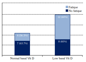 The patients that recovered from COVID-19 (n=31) were subjected to serum vitamin D level measurement after eight weeks from recovery. Eleven patients who had normal levels at the time of infection remained having normal vitamin D levels eight weeks after recovery, while in 16 of 20 patients who had low baseline vitamin D levels, the levels returned to normal range eight weeks after recovery. Fatigue was one of commonest manifestation of both SLE and post-COVID-19. Fatigue was evaluated in 31 patients that recovered from infection; four of 11 (36.3%) patients with normal baseline vitamin D levels and 12 of 20 (60%) patients with low baseline vitamin D levels had persistent fatigue (Figure 2).