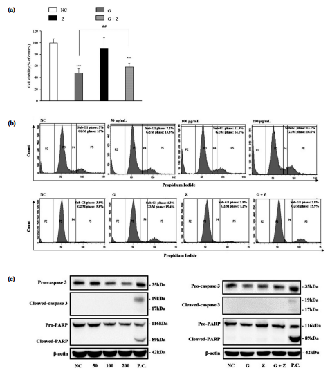 The cell cycle stage was determined using a flow cytometer. When RA-FLSs were treated with GSPE at 50 to 200 μg/mL for 16 h, the number of cells in sub-G1 phase increased to 7.2%, 11.5%, and 13.1% depending on the concentration (50, 100, or 200 μg/mL) of GSPE, respectively (Figure 2b). The number of cells in G2/M phase also increased to 13.3%, 14.1%, and 16.6%, respectively. According to the results of flow cytometry of co-treatment of cells with GSPE and z-VAD-fmk under the same conditions, the number of cells in sub-G1 phase, which increased with GSPE treatment alone, decreased with z-VAD-fmk co-treatment (Figure 2b). In addition, the expression of major apoptosis proteins PARP (89, 116 kDa), pro-caspase 3 (35 kDa), and cleaved-caspase 3 (17, 19 kDa) were examined using Western blotting. When RA-FLSs were treated with GSPE at 50 to 200 μg/mL, the expression of pro-PARP and pro-caspase 3 decreased in a concentration-dependent manner, but the expression of cleaved-caspase 3 and cleaved-PARP was not detected. When RA-FLSs were co-treated with z-VAD-fmk (50 μM) and GSPE, the expression of pro-PARP, which decreased with GSPE treatment alone, increased after z-VAD-fmk co-treatment. U87MG cells treated with TRAIL detected cleaved-PARP and cleaved-caspase 3 expression, but the same was not detected in RA-FLSs (Figure 2c). These results showed that GSPE was involved in the induction of apoptosis accompanied by a G2/M phase arrest in RA-FLSs.