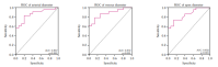 In the ROC analysis for determining cut-off values for arterial diameter with 83% sensitivity and 80% specificity, 30.10 µm (area under the curve [AUC]: 0.857; 95% confidence interval [CI]: 0.737-0.976; p<0.001), for venous diameter with 36.46 µm (AUC: 0.872; 95% CI: 0.762-0.983; p<0.001), for apex diameter with 43.85 µm (AUC: 0.852; 95% CI: 0.735-0.969; p<0.001) cut- off values (Figure 3).