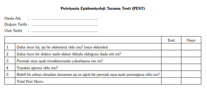 Psoriasis epidemiology screening tool: The questionnaire contains five questions (19). Each question answered "Yes" is scored 1 (one), while each question answered as "No" is scored 0 (zero) and then, the total score is calculated by summing the all item scores of PEST. Questions 1-5 are as follows: 1. Have you ever had a swollen joint (or joints)?; 2. Has a doctor ever told you that you have arthritis?; 3. Do your fingernails or toenails have holes or pits?; 4. Have you had pain in your heel?; 5. Have you had a completely swollen and painful finger or toe for no apparent reason?, respectively.
