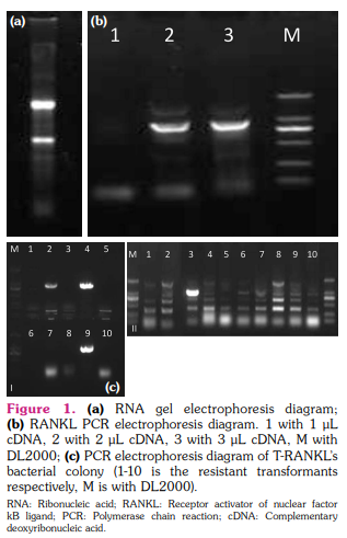 TA cloning of the RANKL gene and sequence analysis: The PCR products were recovered by gel. Proper TA cloning connection reaction system was established and, then, transform Escherichia coli (E.coli) Top10 at 42°C. Finally, the bacterial colony of resistance transformation was identified by PCR.