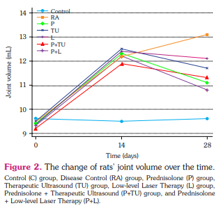 Materials and methods: A total of 56 adult male Wistar rats were divided into seven groups: control (C), disease control (RA), P, TU, LLLT (L), P + TU (P+TU), P + LLLT (P+L) groups. The skin temperature, radiography, joint volume, serum rheumatoid factor (RF), interleukin (IL)-1β, serum tumor necrosis factor-alpha (TNF-α), and histopathological evaluation of joint were performed.