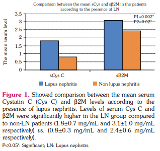 Results: JSLE patients had significantly elevated mean sCyc C and sβ2M levels (1.4±0.8 mg/mL and 2.8±0.9 mg/mL, respectively) compared to the controls (0.6±0.1 mg/mL and 2.0±0.2 mg/mL, respectively; p<0.00). The mean sCys C and sβ2M levels were significantly higher in the LN group, compared to non-LN patients (1.8±0.7 mg/mL and 3.1±1.0 mg/mL, respectively vs. 0.8±0.3 mg/mL and 2.4±0.6 mg/mL, respectively; p=0.002 and p=0.02, respectively). The sCys C levels had significant positive correlations with erythrocyte sedimentation rate (r=0.3, p=0.05), serum creatinine (r=0.41, p= 0.007), 24-h urinary protein (r=0.58, p<0.001), anti-double stranded deoxyribonucleic acid antibodies titers (r=0.55, p=0.002), extra-renal SLEDAI scores (r=0.36, p=0.04), rSLEDAI (r=0.46, p=0.002), and renal class (r=0.7, p=0.0001). Serum β2M levels were significantly negatively correlated with complement 4 levels (r=-0.31, p=0.04) and significantly positively correlated with extra-renal SLEDAI scores (r=0.3, p=0.05).
