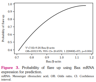 The sensitivity at cut-off value above 0.58 reached to 96% with NPV about 94% (Table 5). In the regression model, the probability of flare-up reached to 100% with increasing the expression of Bax/β-actin; (Y' = -7.02 + 9.24 Bax/β-actin), as well, the likelihood of flare-up increased 10,314 times with every unit increase of Bax/β-actin mRNA expression (odds ratio [OR]=10313.9, p=0.004) (Figure 3).