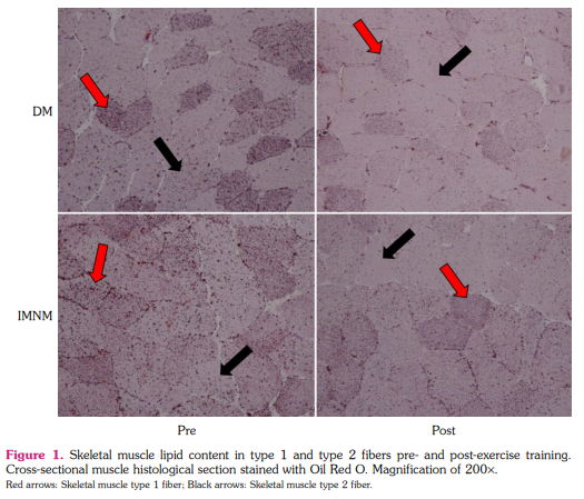 Conclusion: Exercise training attenuated the amount of fat in type I and II muscle fibers in patients with DM and IMNM and increased gene expression related to insulin pathways and lipid oxidation in DM and IMNM. These results suggest that exercise training can improve the quality and metabolic functions of skeletal muscle in these diseases.