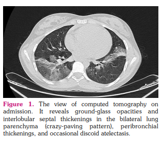A 17-year-old female patient was admitted with complaints of a rash on the feet, a lesion on the palate, and cough. Her medical records showed that she used inhaler and systemic corticosteroid treatment with the diagnosis of asthma and allergic pulmonary aspergillosis for two years. Physical examination revealed a 1 cm2 ulcerated lesion on the upper palate, petechial rash on bilateral feet, and expiratory rhonchus in lung auscultation. Complete blood count showed eosinophilia (white blood cell count: 10.7x103/μL, eosinophil count: 1.5x103/μL). Acute phase reactants and troponin I levels were elevated [C-reactive protein: 17 mg/L (normal <5 mg/L), erythrocyte sedimentation rate: 44 mm/h (normal <20 mm/h), troponin I level: 15.7 ng/mL (normal <0.026 ng/mL). PR3 (proteinase 3)- ANCA and MPO (myeloperoxidase)-ANCA were negative. At presentation, pansinusitis was determined in the paranasal magnetic resonance imaging, and computed tomography revealed ground-glass opacities and interlobular septal thickenings in bilateral lung parenchyma (crazypaving pattern), peribronchial thickenings, and occasional discoid atelectasis (Figure 1). Bone marrow evaluation revealed an increase in the eosinophilic series, and leukemia was ruled out. Eosinophilic infiltration was detected in the biopsy sample taken from the lesion on the palate. The patient was diagnosed with EGPA based on the American College of Rheumatology classification criteria. High-dose methylprednisolone pulse and intravenous immunoglobulin therapy were administered to the patient, and methotrexate was added to the treatment regimen. Good symptom control was achieved on the second week of this treatment. Two months after discharge, she was readmitted with the complaint of syncope and chest pain. A 14 mm pericardial effusion was detected by echocardiography. Cardiac magnetic resonance imaging and laboratory data were consistent with acute myocarditis. Cyclophosphamide therapy was initiated at a dose of 500 mg per month. After the third dose of cyclophosphamide, myocarditis and pericardial effusion relapsed, and rituximab treatment was commenced. The child had a good initial response to rituximab, but pericardial effusion recurred in the third month of the therapy, and at that time, the highest percentage of eosinophils in complete blood count (60.6%) was observed. Rituximab was switched to mepolizumab (100 mg/month). After the second dose of mepolizumab treatment, eosinophil counts returned to the normal range, and pericardial effusion completely regressed. The dose of methylprednisolone was tapered and then stopped on the second month of mepolizumab treatment. Eosinophil percentage and troponin I levels before and after mepolizumab treatment are shown in Figure 2. No mepolizumab-related adverse event was observed. She has been followed for one year in complete remission under mepolizumab treatment.