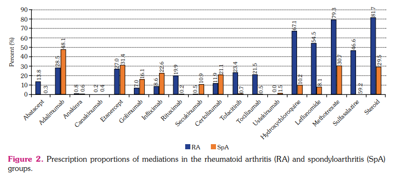 In our study, the treatment choice in RA and SpA and the proportions of bDMARDs in each disease were significantly different, except for anakinra and canakinumab prescribed to patients at similar rates. Biological drugs, such as TNF inhibitors, B-cell/T-cell/IL-6 blockers, or JAK (Janus kinase) inhibitors used in rheumatic diseases, are safe and effective medications.[22] However, the treatment choice is based on various factors, including guideline recommendations, patient characteristics, previous medications, and availability and access to treatment. The drug choice differences in our study between RA and SpA should be cautiously interpreted as the results were only limited to the last prescribed treatment and did not include any data about the previous therapies. A switch between two bDMARDs is frequently seen, particularly once an ineffectiveness, adverse event, and patient or physician choice occurs.[22,23] A study by Kalyoncu et al.,[24] also conducted on the TReasure database, evaluated the switches in the bDMARDs in RA and SpA patients and revealed that the main reasons for switching were ineffectiveness and adverse or side effects, as anticipated. Although the changes in treatment choice were not assessed in this study, the most frequently prescribed drugs were generally similar to the TReasure database's previous assessments.