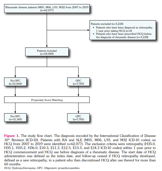 Figure 1. The study flow chart. The diagnosis encoded by the International Classification of Disease 10th Revision (ICD-10). Patients with RA and SLE (M05, M06, L93, and M32 ICD-10 codes) on HCQ from 2007 to 2019 were identified n=62,077). The exclusion criteria were retinopathy (H35.0, H35.1, H35.2, H36.0, E10.3, E11.3, E12.3, E13.3, and E14.3 ICD-10 codes) within 1 year prior to HCQ commencement and HCQ use before diagnosis of a rheumatic disease. The start date of HCQ administration was defined as the index date, and follow-up ceased if HCQ retinopathy developed, defined as a new retinopathy, in a patient who then discontinued HCQ after use thereof for more than 60 months. HCQ: Hydroxychloroquine; OPC: Oligomeric proanthocyanidins.