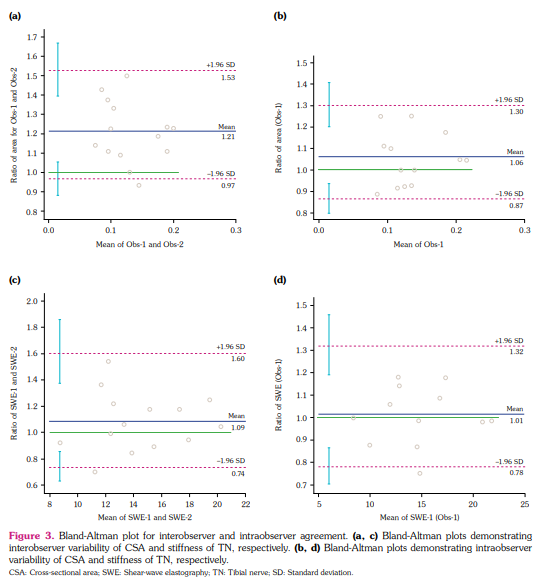 Statistical analysis was performed using the IBM SPSS version 22.0 (IBM Corp., Armonk, NY, USA) and MedCalc version 21.1 (MedCalc Software Ltd, Ostend, Belgium) software. The Kolmogorov-Smirnov test was used to examine the normality distribution of variables. Nonparametric tests were used for nonnormally distributed variables. The Mann-Whitney U test was used to assess significant differences in continuous variables, while the chi-square test was used to analyze categorical variables at baseline. Spearman’s correlation analysis evaluated the correlation between nonparametric variables. A correlation coefficient (r) of <0.2 was considered negligible, 0.2 to 0.4 was fair, 0.41 to 0.60 was moderate, 0.61 to 0.80 was good, and >0.8 was considered excellent agreement. Intraclass correlation coefficient (ICC) with 95% confidence interval (CI) levels was used to assess the intra- and interobserver agreement for CSA and stiffness measurements. An ICC score of 0.81-1.0 indicated excellent agreement, 0.61-0.80 suggested good agreement, 0.41-0.6 showed moderate agreement, 0.21-0.40 indicated fair agreement, and 0-0.20 suggested slight agreement.[17] Moreover, the Bland-Altman plot was used to evaluate the interobserver agreement. A p-value <0.05 was considered statistically significant.