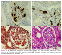 No abnormality was found in the patient's vital signs during the examination. There was no difference between arterial pulses on examination. However, pretibial edema was present. Although there were no signs of disease progression in the new imaging compared to the previous one, acute phase reactants were high, and a 24-h urine sample showed 11.5 g of proteinuria. No new critical stenosis was detected in the renal arteries in Doppler ultrasound imaging, and no erythrocyte casts were detected in the urine. A kidney biopsy was performed for the diagnosis of nephrotic-level proteinuria, and a deposition pattern was observed in the renal biopsy specimen with Congo red staining (Figure 1).