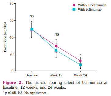 In addition, the use of immunosuppressive/ immunomodulatory agents and antimalarials was similar between the two groups at baseline. The mean dose of prednisone medication in the standard therapy group was 48.62±8.3 mg/day at baseline, which was comparable with the belimumab group (49.35±96 mg/day, p=0.75).