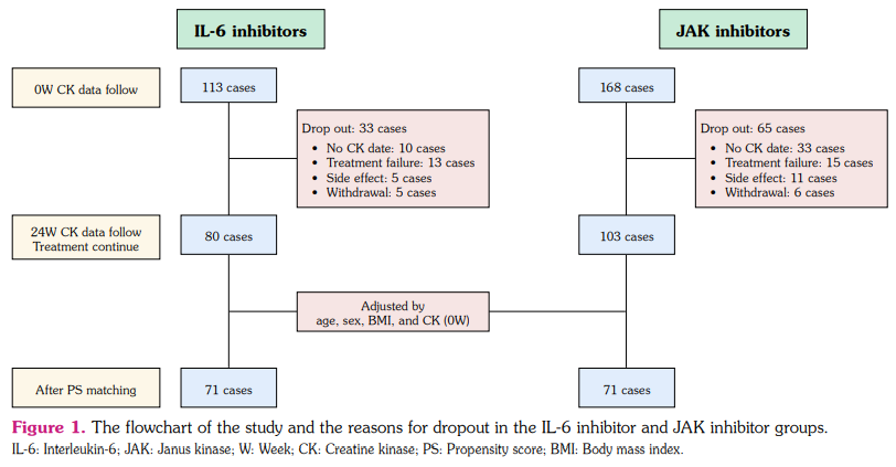 Patients and methods: A multicenter database of JAK inhibitor and IL-6 inhibitor treatment was retrospectively searched between January 2016 to December 2022; 142 cases (117 females, 25 males, mean age: 63.8±13.0 years; range, 20 to 85 years), with 71 cases in each group, were extracted by propensity score matching using age, sex, body mass index, and CK at 0 weeks. The outlier rate was compared. Patients’ background characteristics related to elevated CK levels at 24 weeks were investigated by univariate and multivariate analyses.