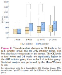 Creatine kinase levels were significantly elevated over time in the JAK inhibitor group compared to the IL-6 inhibitor group, with a difference in the outlier rate of over Grade 1. If the CK elevation is an indirect effect of decreased disease activity, improved quality of life, or increased activity, CK should be elevated not only in the JAK inhibitor group but also in the IL-6 inhibitor group. However, since the CK level was only slightly elevated with IL-6 inhibitors, it is possible that the CK elevation is due to a direct blocking of JAK-STAT signaling.