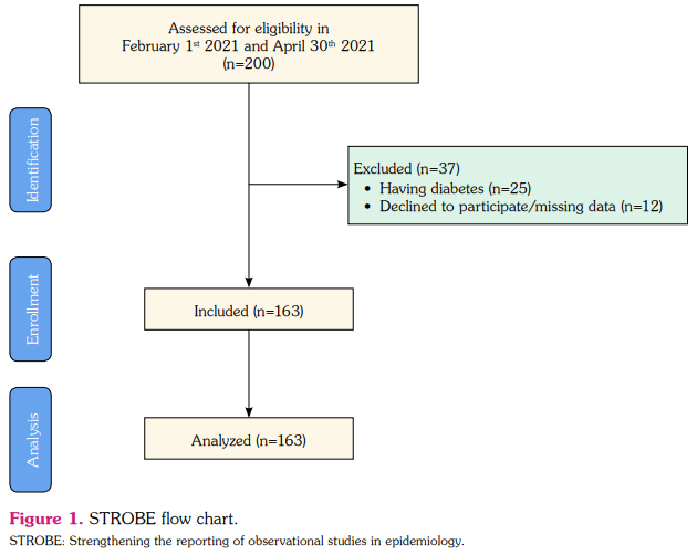 This single-center, cross-sectional study was conducted at the Ankara City Hospital, Department of Physical Medicine and Rehabilitation (PMR) between February 1, 2021, and April 30, 2021. The STROBE (Strengthening the Reporting of Observational Studies in Epidemiology) guidelines were followed.[17] Inclusion criteria were as follows: age between 18 and 50 years; confirmed diagnosis of COVID-19 by a positive real-time polymerase chain reaction (PCR) testing of nasopharyngeal and oropharyngeal specimens; individuals who recovered from SARS-CoV-2 infection and who were diagnosed by real-time reverse PCR testing of nasopharyngeal/oral swab samples; the existence of musculoskeletal pain for more than three months after the COVID-19; sufficient cognitive function to understand the questions and having completed the full questionnaire. Only the patients presenting to the outpatients clinics of the PMR department were included in the study. Exclusion criteria were as follows: a preexisting history of pain or any preexisting medical comorbidity (explaining the presence of pain symptomatology); having any chronic systemic, rheumatic, neurological, or musculoskeletal diseases (e.g., diabetes, autoimmune diseases, rheumatoid arthritis, malignancy, multiple sclerosis, Guillain-Barré syndrome, or neurodegenerative diseases); having vitamin deficiencies that may cause neuropathy or chronic neuropathic pain; having any clinical condition affecting the ability to complete self-administered instruments or any diagnosed psychological disease before or after the COVID-19 infection; having an active COVID-19 infection. Additionally, patients who had chronic musculoskeletal pain before COVID-19, those diagnosed with sarcopenia, cachexia, or myositis during or after COVID-19, and patients using drugs for chronic neuropathy were excluded from the study. Since neuropathic pain is common in patients with diabetes, they were also excluded. Patients over 50 years of age were not included due to the increased incidence of chronic diseases and comorbidities in this population. Of a total of 200 patients initially assessed for inclusion, 163 (85 females, 78 males; mean age: 41.7±4.3 years; range, 22 to 50 years) were eligible (Figure 1).