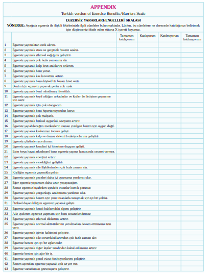 - Ortabag T, Ceylan S, Akyüz A, Bebis H. The validity and reliability of the exercise benefits/barriers scale for Turkish Military nursing students. S Afr J Res Sport Phys Educ Recreation 2010;32:55-70. doi: 10.4314/sajrs.v32i2.59297. DOI: 10.4314/sajrs.v32i2.59297