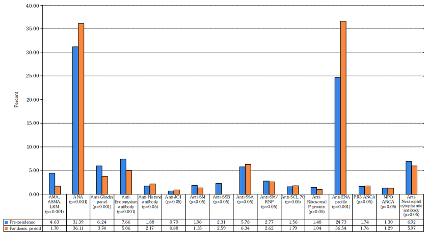 Patients and methods: Samples of 89,108 individuals (29,033 males, 60,075 females; median: 36 years; range, 0 to 96 years) who underwent autoimmune testing between January 2017 and May 2022 were retrospectively analyzed. The prepandemic period was defined as May 1, 2017, to March 20, 2020, while the pandemic period was defined as March 20, 2020, to May 31, 2022.