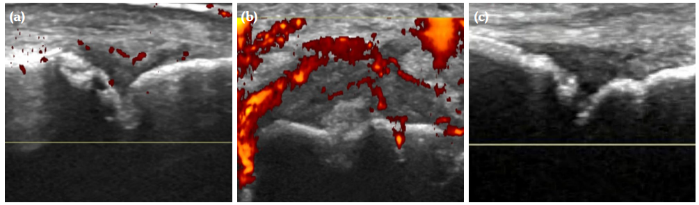 One of the limitations to this study is the lack of other imaging and pathological comparisons. Magnetic resonance imaging is an effective tool to examine early RA and to evaluate therapeutic effect; it is considered gold standard for RA research. However, in practice, it is time-consuming to perform MRI examinations on all the affected joints of the patient's hands. Moreover, MRI can be costly for many patients. On the other hand, although needle biopsy of joint synovium is helpful for accurate diagnosis of disease, it is an invasive operation with high technical requirements for the operator and may, thus, not be the best choice for patients.