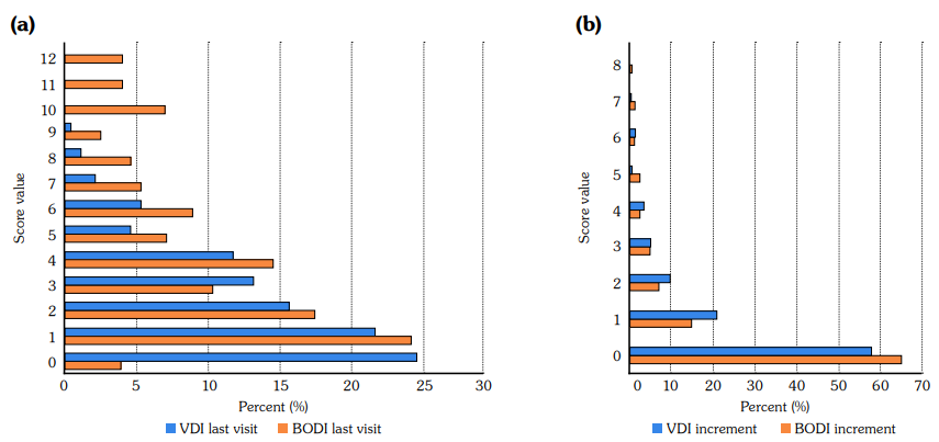 The trend of change of both scores during the follow-up period is shown in Figure 4a. During the follow-up period, 199 (70.6%) patients showed a progressive increment of VDI by ≥1 point as opposed to 99 (35%) patients for BODI (p=0.001).