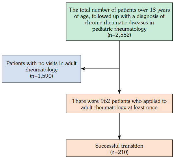 Results: Out of 2,552 referred patients, 210 (8.2%) patients (117 females, 93 males; mean age: 25.2±5.6 years; range, 18 to 44 years) transitioned successfully. Juvenile idiopathic arthritis and familial Mediterranean fever were the most prevalent rheumatic diseases. The median transition time was four months (interquartile range, 1 to 13 months) in patients with successful transition, and the early transition rate was 46.7%. Receiving biologic disease-modifying antirheumatic drugs was found to be associated with early transition (28.6% vs. 17.0%, p=0.040), and higher education levels and familial Mediterranean fever diagnosis were found to be associated with late transition. The treatment was changed for about half of the patients after transition to adult rheumatology. Patients with juvenile idiopathic arthritis were reclassified in 25 (31.6%) patients as rheumatoid arthritis, in 22 (27.8%) patients as ankylosing spondylitis, in 20 (25.3%) patients as nonradiographic axial spondyloarthritis, and in eight (10.1%) patients as psoriatic arthritis.
