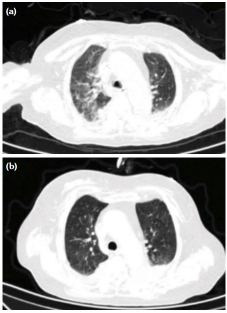 After admission, the patient underwent seven sessions of continuous renal replacement therapy (CRRT), six sessions of plasma exchange (PE), four sessions of intermittent hemodialysis (IHD), imipenem and cilastatin sodium for anti-infection, voriconazole as antifungal, methylprednisolone 40 mg once daily intravenous infusion, and cyclophosphamide 0.6 g intravenous infusion. On Day 4 of admission, the patient had hemorrhagic spots on the nose and white spots on the tongue (Figure 1a). Nasal bleeding was significantly reduced after the second plasmapheresis (Figure 1b). After the fifth plasmapheresis, the nose swelling and bleeding disappeared (Figure 1c). On Day 26 of admission, the urine volume was 3,000 mL within 24 h, and renal function recovered and improved after examination. After six plasmapheresis sessions, thoracic CT exudation decreased significantly (Figure 2). On Day 29 of hospitalization, the patient was discharged with complete improvement, urine volume returned to normal, blood creatinine decreased to 132 µmol/L, and blood culture test result was negative. At a later follow-up, a moderate dose of prednisone (30 mg, gradually reduced to 5 to 10 mg for maintenance) was administered orally combined with cyclophosphamide monthly (0.8 to 1.0 g each time, 6 to 8 g in total) and intravenous drip shock therapy was administered to maintain immunosuppression. No obvious signs of disease were observed.