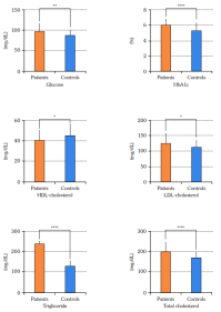 The mean serum glucose and HbA1c levels were higher in patients than in controls (p<0.01) (Table 2 and Figure 1). The lipid profiles of the patients were unfavorable compared to those of the controls, as confirmed by high LDL-C, triglyceride and total cholesterol levels and low HDL-C levels (Table 2 and Figure 1).