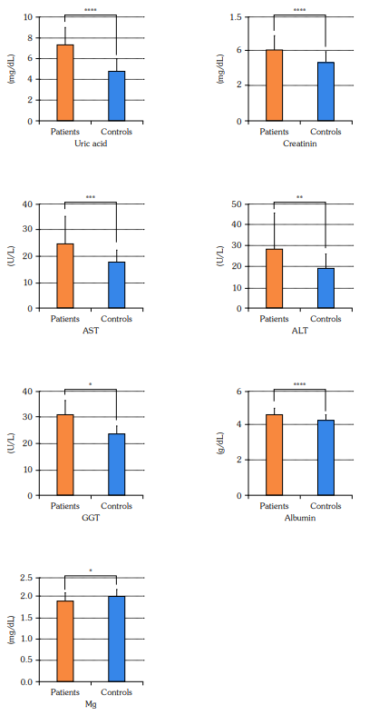 In the current study, we observed significant differences in the serum uric acid, HDL-C, LDL-C, triglyceride, total cholesterol, creatinine, AST, ALT, GGT, CRP, ESR, albumin, HbA1c, and Mg levels. Serum Mg and HDL-C levels were lower in gout patients, whereas the levels of other biochemical parameters were higher in the healthy group. According to these results, patients with gout are likely to develop hyperlipidemia, DM, liver and kidney dysfunctions, and related morbidities and should be followed closely for these diseases.