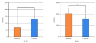 The serum IL-10 levels of the patients were significantly lower than those of the controls. The serum irisin levels were significantly higher in the patient group than in the control group (Table 2 and Figure 4).