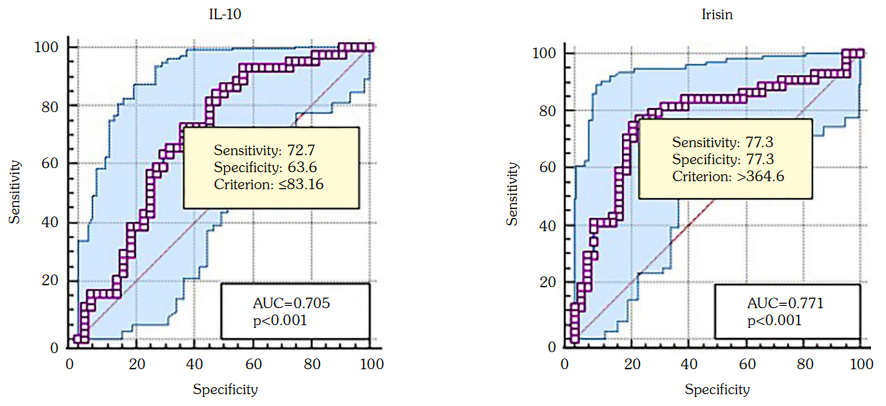 The results of the ROC analysis showing the effects of serum IL-10 and irisin levels in diagnosing gout and distinguishing patients and healthy individuals are shown in Figure 5. The cut-off value was ≤83.1 pg/mL for IL-10 and >364.6 pg/mL for irisin. However, ROC curve analysis revealed that the two parameters were not superior to each other in distinguishing between patients and healthy individuals (inter-regional difference for IL-10 and irisin comparison: 0.0661, p=0.414).