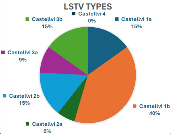 A total of 130 patients (82 males, 48 females) who were classified as axSpA in accordance with ASAS criteria were included. The mean age was 44.84 ± 12.08 years. About 66.2% of the patients (n = 86) had r-axSpA. The rate of usage of biologic DMARDs was 73.1% (n = 95). The rate of presence of LSTV was 25.4% (n = 33). Among patients with LSTV, 69.7% (n = 23) were male. The distribution of LSTV types is shown in Figure 1, with Castellvi type 1b being the most common (39.4%).
