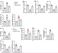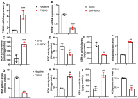 We transfected PRDX3 or si-PRDX3 plasmid to enhance or inhibit PRDX3 mRNA expression in the in vitro model, respectively (Figure 3A and B). Si-PRDX3 increased the MDA activity levels and ROS production levels while decreasing SOD and GSH-PX activity levels in the in vitro model (Figure 3C-F). PRDX3 upregulation reduced MDA activity levels and ROS production levels and increased SOD and GSH-PX activity levels in the in vitro model (Figure 3G-J).
