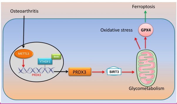In conclusion, in the model of osteoarthritis cartilage injury, METTL3-mediated m6A modification decreases PRDX3 mRNA stability. In the osteoarthritis model, PRDX3 induced SIRT3 expression to regulate ROS accumulation and mitochondria-dependent ferroptosis (Figure 11). Further elucidation of the role of PRDX3 and its relationship with the regulation of the SIRT3 pathway can facilitate the understanding of ROS accumulation and mitochondria-dependent ferroptosis and improve the clinical management of osteoarthritis. Targeting METTL3 or PRDX3 is thus a potentially effective therapeutic strategy for patients with osteoarthritis cartilage injury.