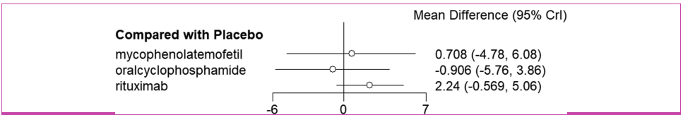 Network meta-analysis results indicated no significant statistical differences between placebo and the 4 drugs (P > .05, I 2 = 16%) (Figure 5), and there was no significant statistical difference between the drugs (P > .05). (Table 4). According to the SUCRA rankings, the top 3 drugs are rituximab (0.591), oral cyclophosphamide (0.585), and mycophenolate mofetil (0.585) (Table 5).