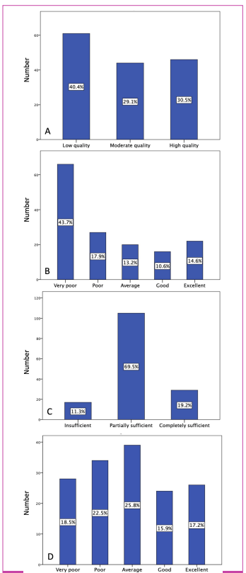 Mean audio quality was 4.81 ± 0.50 (median: 5). Assessment of visual quality revealed that 86.8% (n = 131) of the videos were available in high definition, while 13.2% (n = 20) were limited to standard definition.