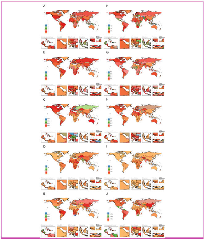In 2019, the highest regional ASIR and ASPR were observed in Europe and the Americas, while the lowest were observed in Southeast Asia (Table 1). Although regional ASMR was relatively stable, ASDR exhibited substantial variability, especially for RHD. In the Eastern Mediterranean, RHD had an ASMR of 2.11 per 100 000 (95% UI: 1.55, 2.77) and an ASDR of 178.44 per 100 000 (95% UI: 136.07, 226.71); similar high burdens were observed in South-East Asia (ASMR: 2.09 per 100 000, 95% UI: 1.76, 2.47; ASDR: 175.27 per 100 000, 95% UI: 146.30, 209.34).