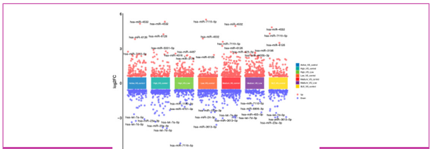 After performing microarray analysis on the submitted samples, library construction was completed by Huayin Biomedical Technology Co. Using the database, an overall analysis of differential genes in exosomes was conducted among 3 groups of SLE patients with varying disease activity levels and healthy controls. The comparisons included: between high and low disease activity within SLE subgroups (high vs. low, medium vs. low), between varying disease activity of SLE and healthy controls (high vs. control, medium vs. control, low vs. control), as well as between the overall SLE group and healthy controls (SLE vs. control), and between the relatively active SLE group (active, high + medium) and healthy controls (active vs. control). The results were visualized using volcano plots to represent the overall distribution of each group (Figure 4). In the plots, the x-axis represents the log2-transformed fold change of gene expression, while the y-axis represents the −log10-transformed P-value indicating the significance of differential expression. Red dots represent upregulated genes, and blue dots represent downregulated genes. Among the consistently differentially expressed miRNAs across multiple comparisons, let-7a-5p, miR23a-3p, and miR-4532 were identified as top-ranking candidates due to their recurrent and statistically significant differential expression, as well as their potential biological relevance. let-7a-5p and miR-23a-3p showed a consistent downregulation pattern in patients with high disease activity compared to those with low activity or controls. In contrast, miR-4532 was significantly upregulated in patients with higher disease activity levels.