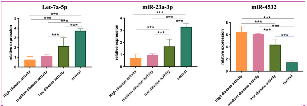 To analyze the miRNA composition of plasma exosomes in SLE patients with different disease activities and healthy controls, microarray analysis was used to identify specifically expressed miRNAs. The findings revealed 73 differentially expressed miRNAs among different disease activity groups, of which 49 were upregulated and 24 were downregulated. The investigation demonstrates the differential expression of let-7a-5p, miR-23a-3p, and miR-4532 in exosomes. These findings were further validated using PCR.